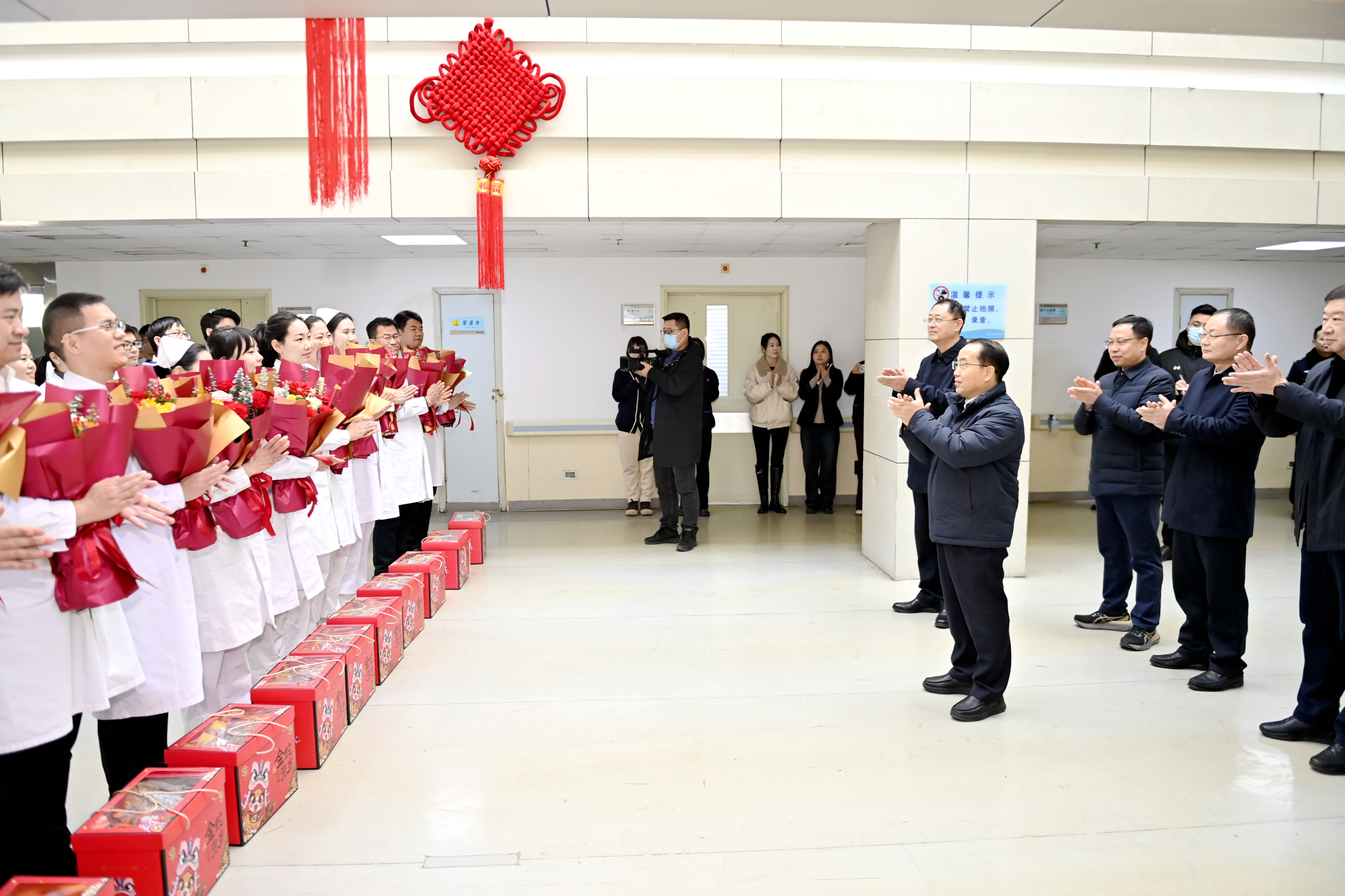 随后,李毛、江俊富一行来到总医院,向该院医务工作者代表送上鲜花、慰问品,并与大家亲切握手,询问他们的工作和生活情况。李毛指出,过去的一年,集团医务工作者以一流的技术,为广大干部职工以及全市市民提供了一流的医疗服务,付出的辛勤和汗水令人感动。春节将至,你们仍然坚守在岗位,舍小家、为大家,为职工健康保驾护航。在此,向大家表示衷心感谢,祝福大家在新的一年工作更加顺利、心情更加舒畅、生活更加幸福。