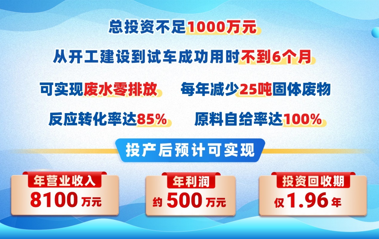 据介绍,该项目以该公司自产的不溶性糖精为原料,采用一步酯化工艺合成甲磺胺产品。该产品广泛应用于农药、医药和染料领域。项目总投资不足1000万元,远低于采用传统工艺的同等规模行业项目投资成本,从开工建设到试车成功用时不到6个月。按当前甲磺胺市场价格计算,项目投产后预计可实现年营业收入8100万元,年利润约500万元,投资回收期仅需1.96年。这种“小投入、大产出”的模式为传统化工企业转型升级提供了经济可行的实践路径。