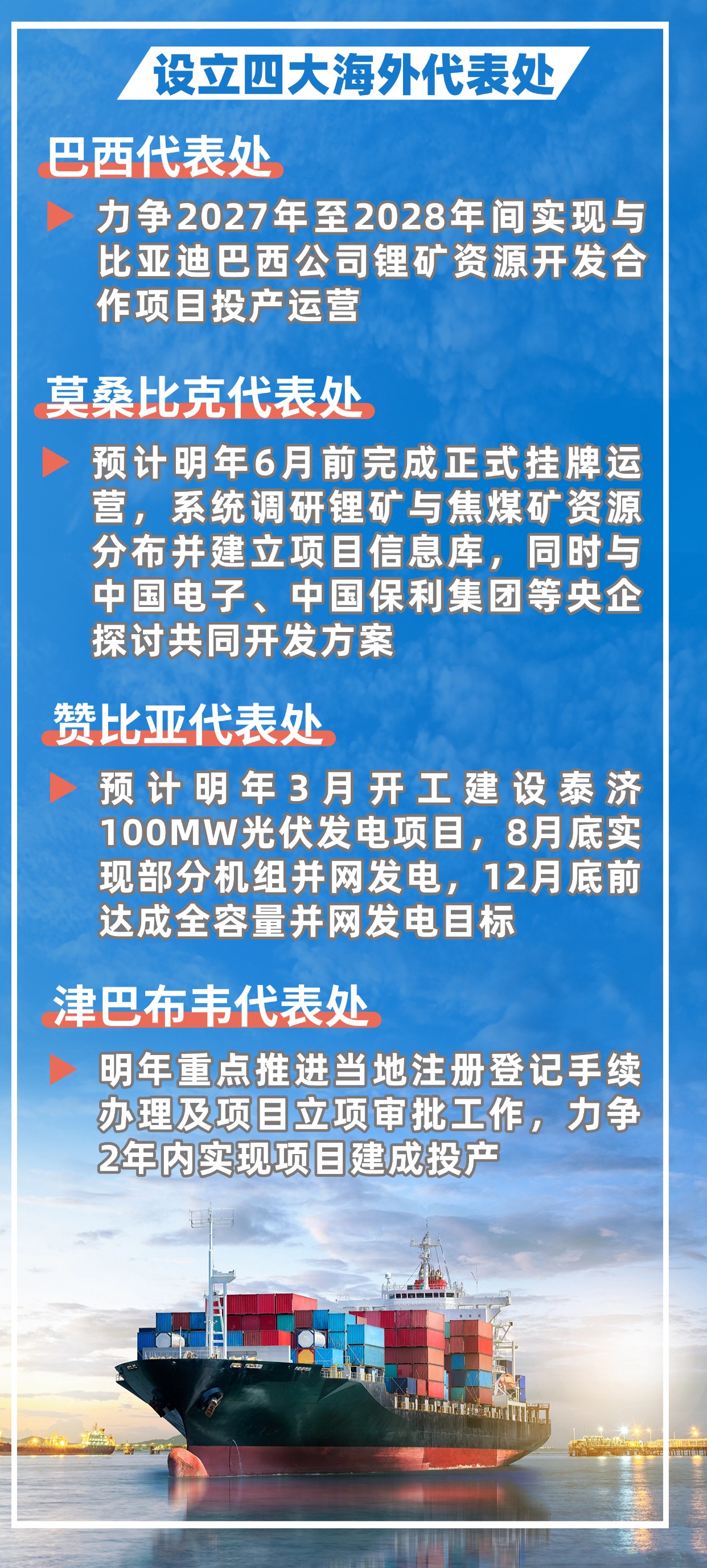 当前,全球能源与资源格局正经历深刻变革,新能源产业加速崛起,特别是非洲、南美洲等地新能源需求旺盛。出海布局不仅是集团积极响应国家“双循环”战略,更是突破发展瓶颈、抢占新能源赛道的关键。通过整合海外资源,集团将构建“资源—技术—市场”一体化优势,为企业和职工创造更广阔的发展空间。