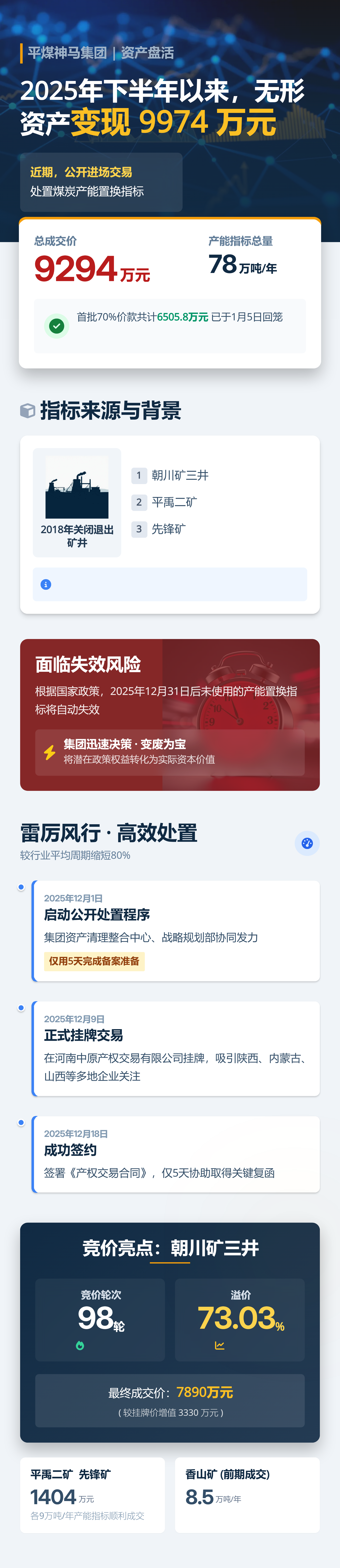 根据国家政策要求,2025年12月31日后未使用的煤炭产能置换指标将自动失效。为确保国有资产效益最大化,集团迅速决策,于2025年12月1日启动公开处置程序,集团资产清理整合中心、战略规划部等协同发力,5天就完成了评估备案等相关资料的准备,较行业平均周期缩短80%,为后续竞价争取了时间优势。