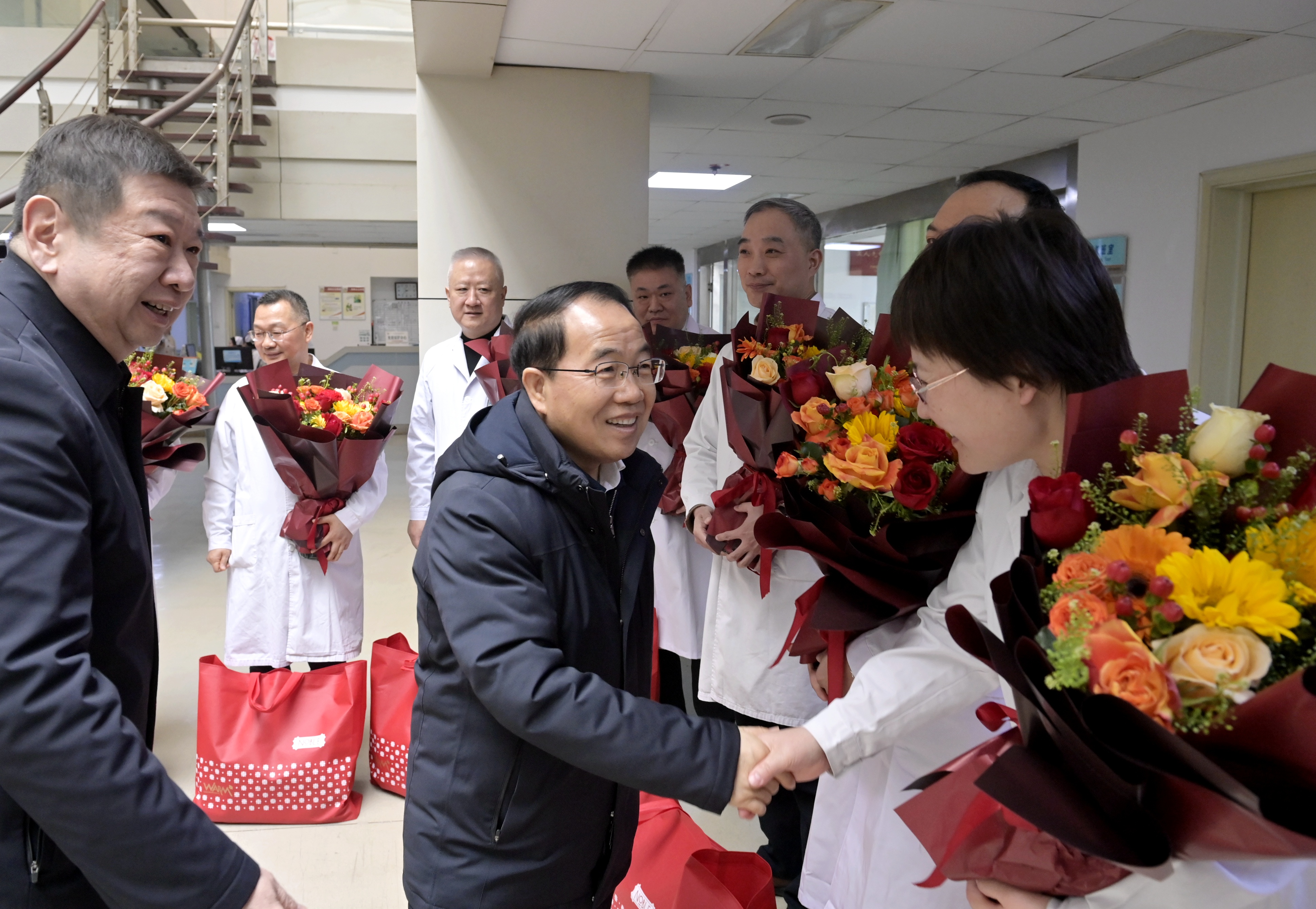 2月10日上午,李毛、江俊富来到总医院,为医务工作者送上鲜花和慰问品,对大家过去一年为守护广大干部职工以及市民生命健康所付出的辛勤努力表示衷心感谢,充分肯定总医院在疾病救治、公共卫生服务等方面取得的成绩。李毛说,新的一年,总医院肩负着新的使命。希望广大医务工作者持续提升医疗服务质量和水平,助力重点学科建设,为推进健康企业、健康中国建设作出新的更大贡献。